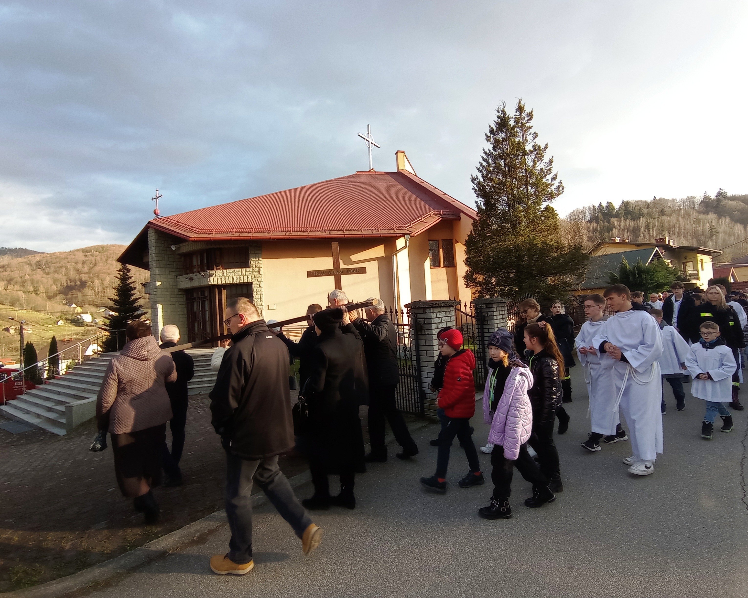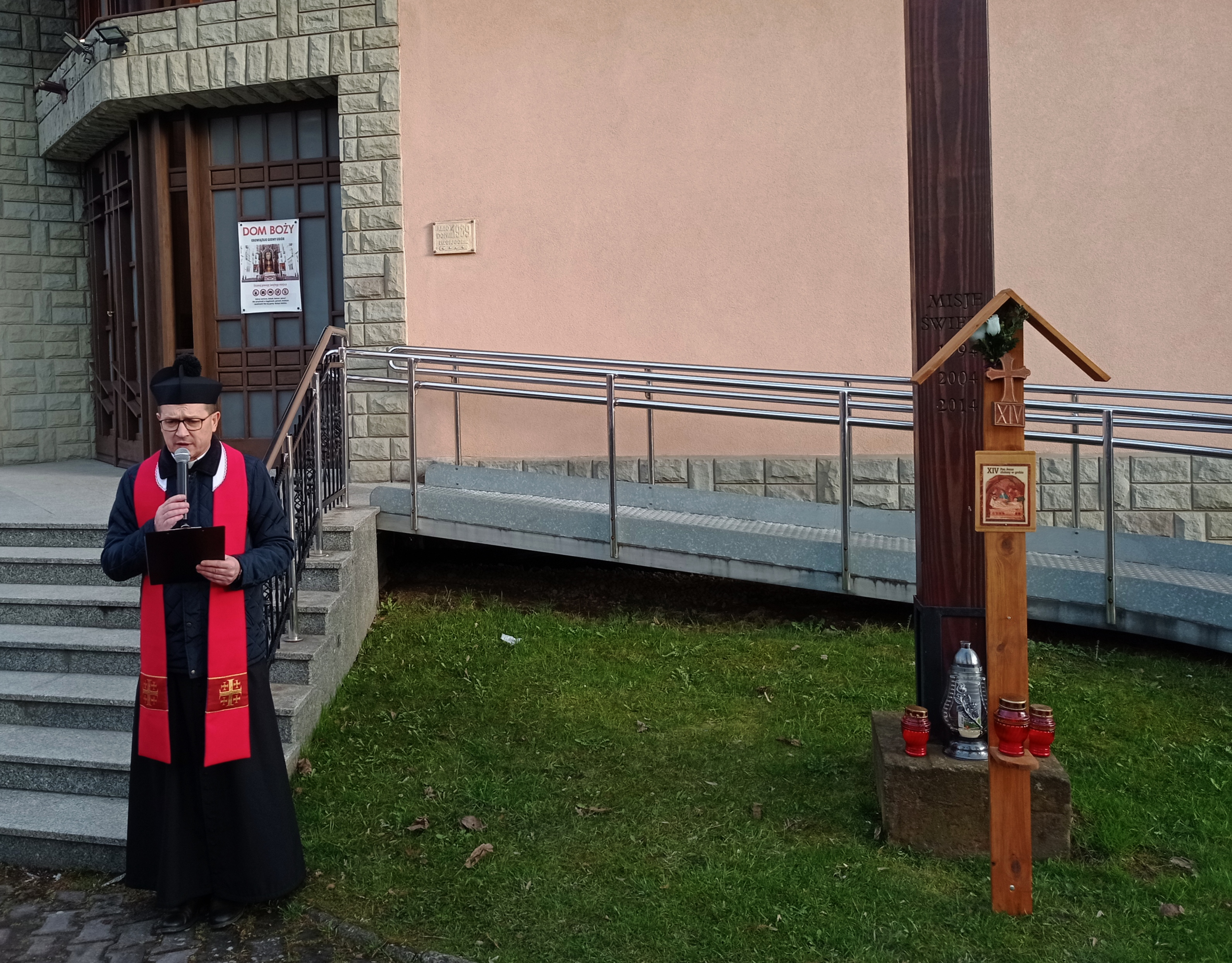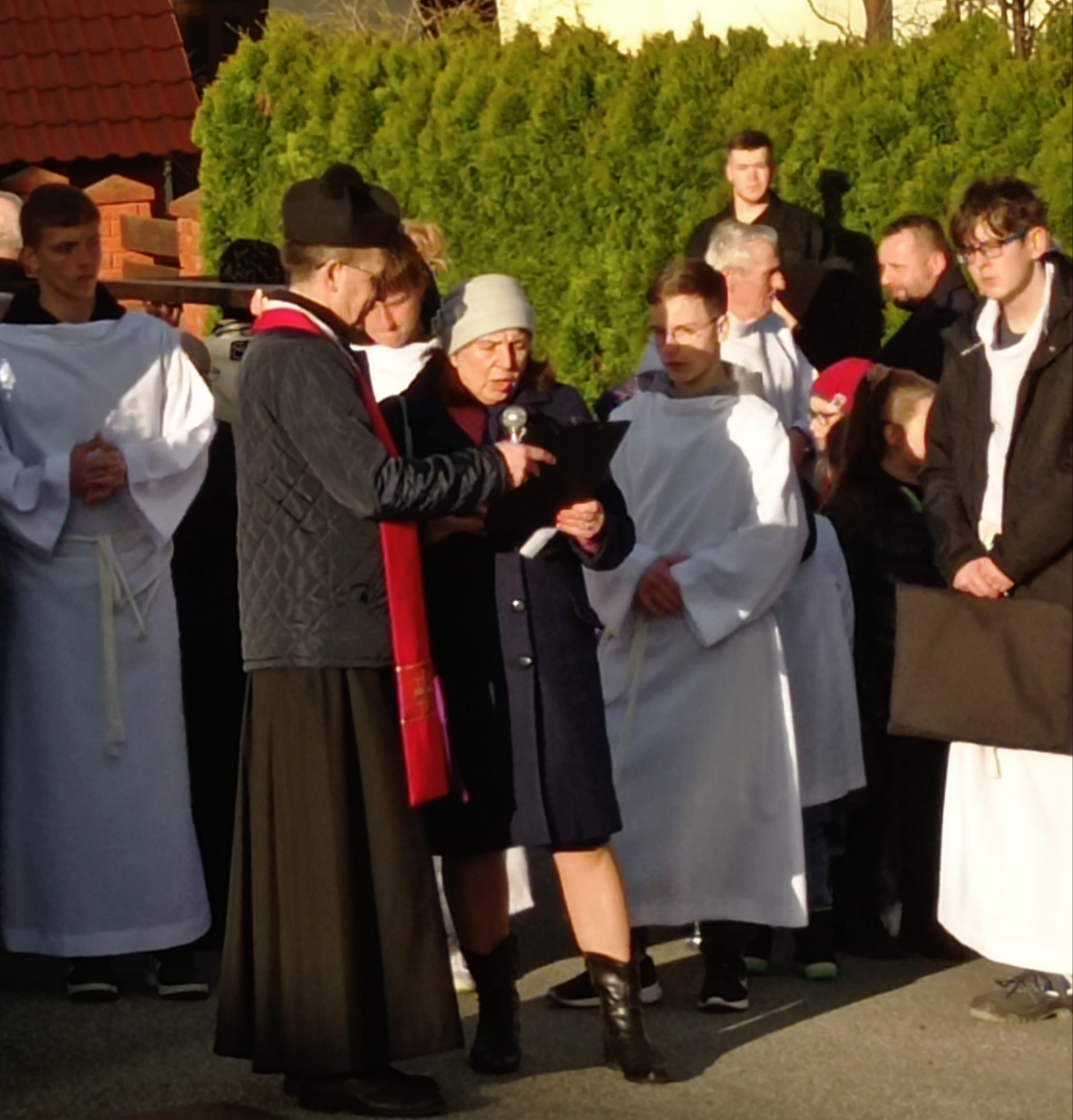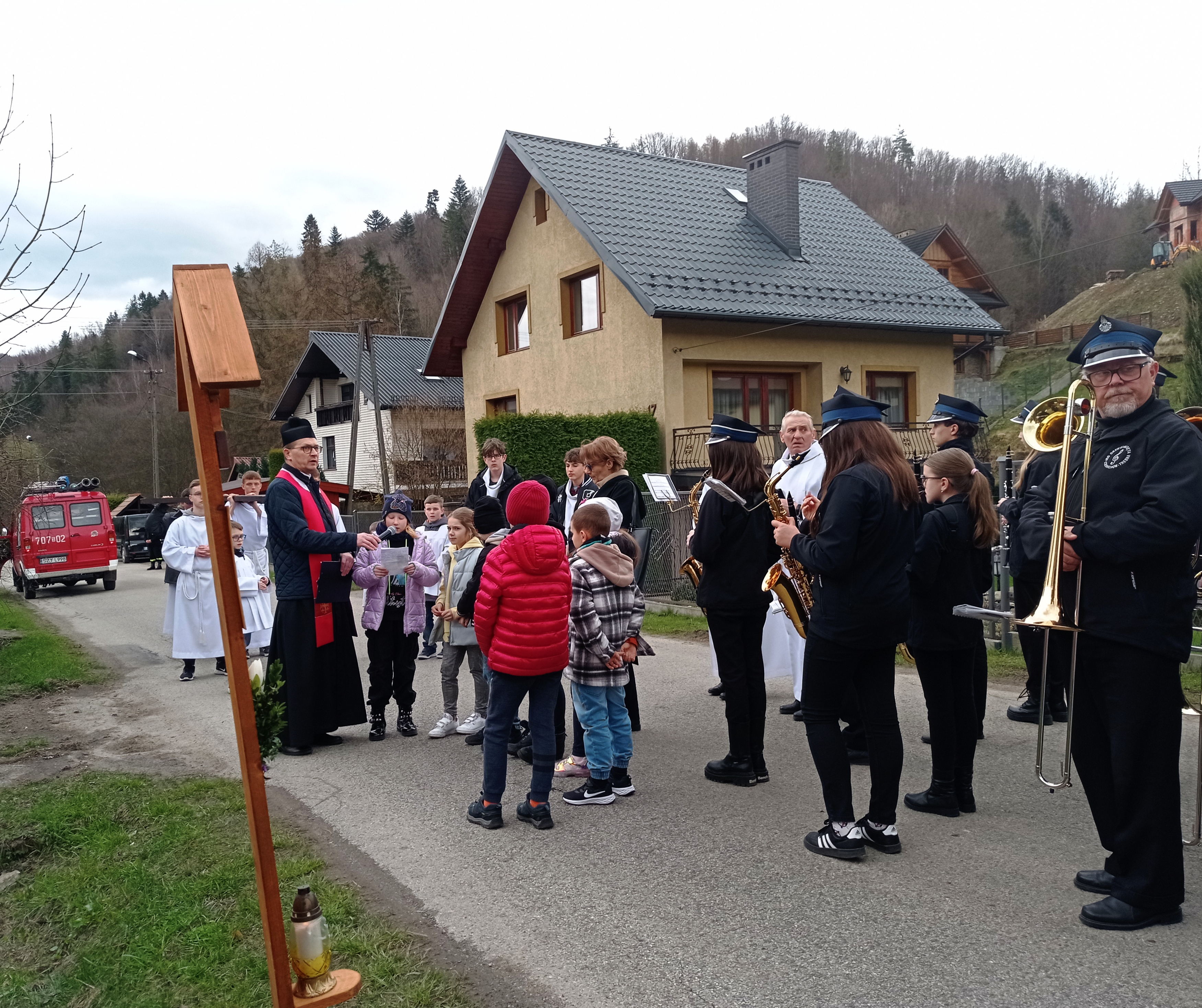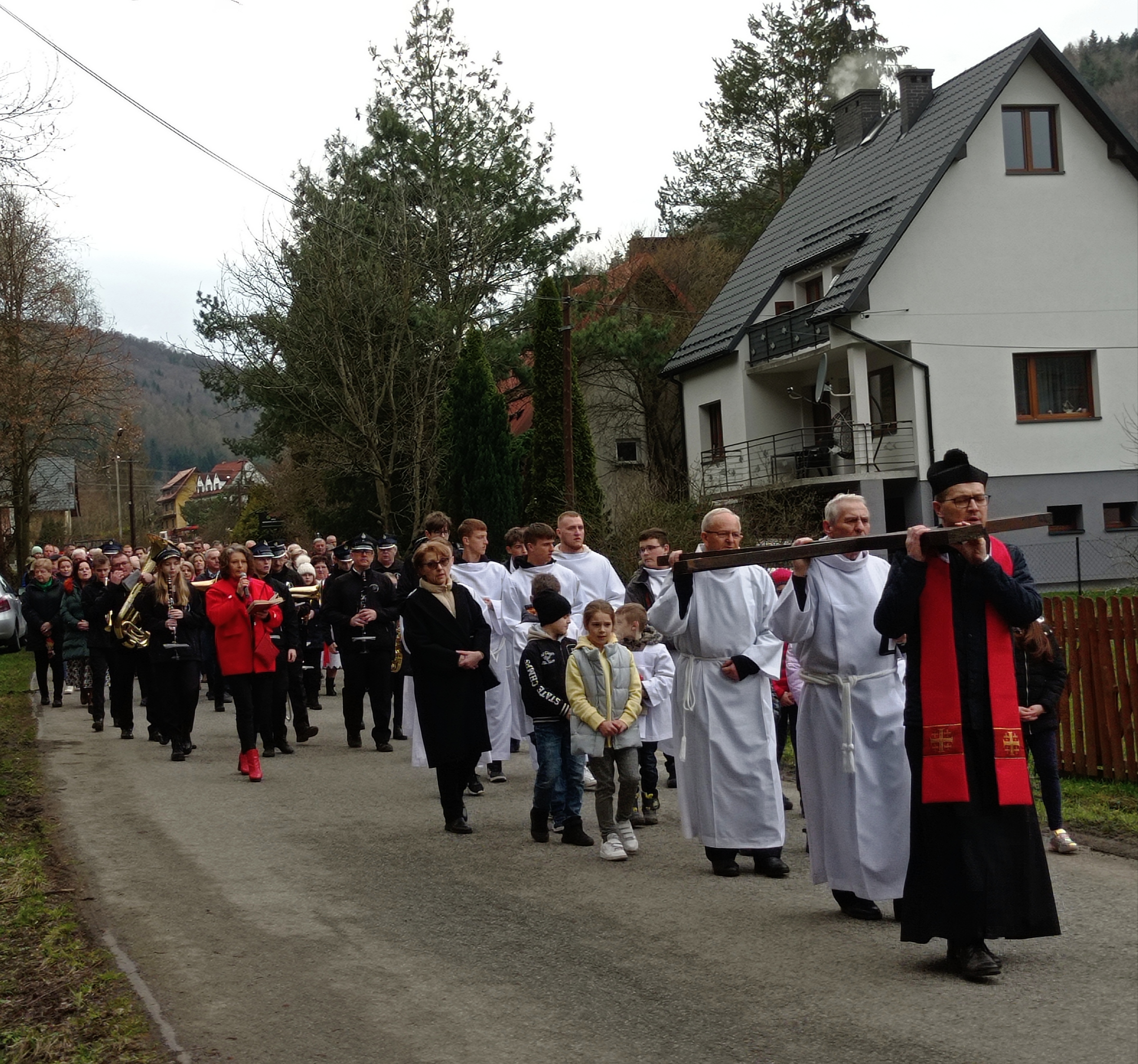 Rozpoczęcie rozważań Drogi Krzyżowej – krzyż nieśli członkowie poszczególnych grup parafialnych, przedstawiciele stanów: dzieci, młodzieży, dorosłych. Towarzyszyła nam Orkiestra Dęta.