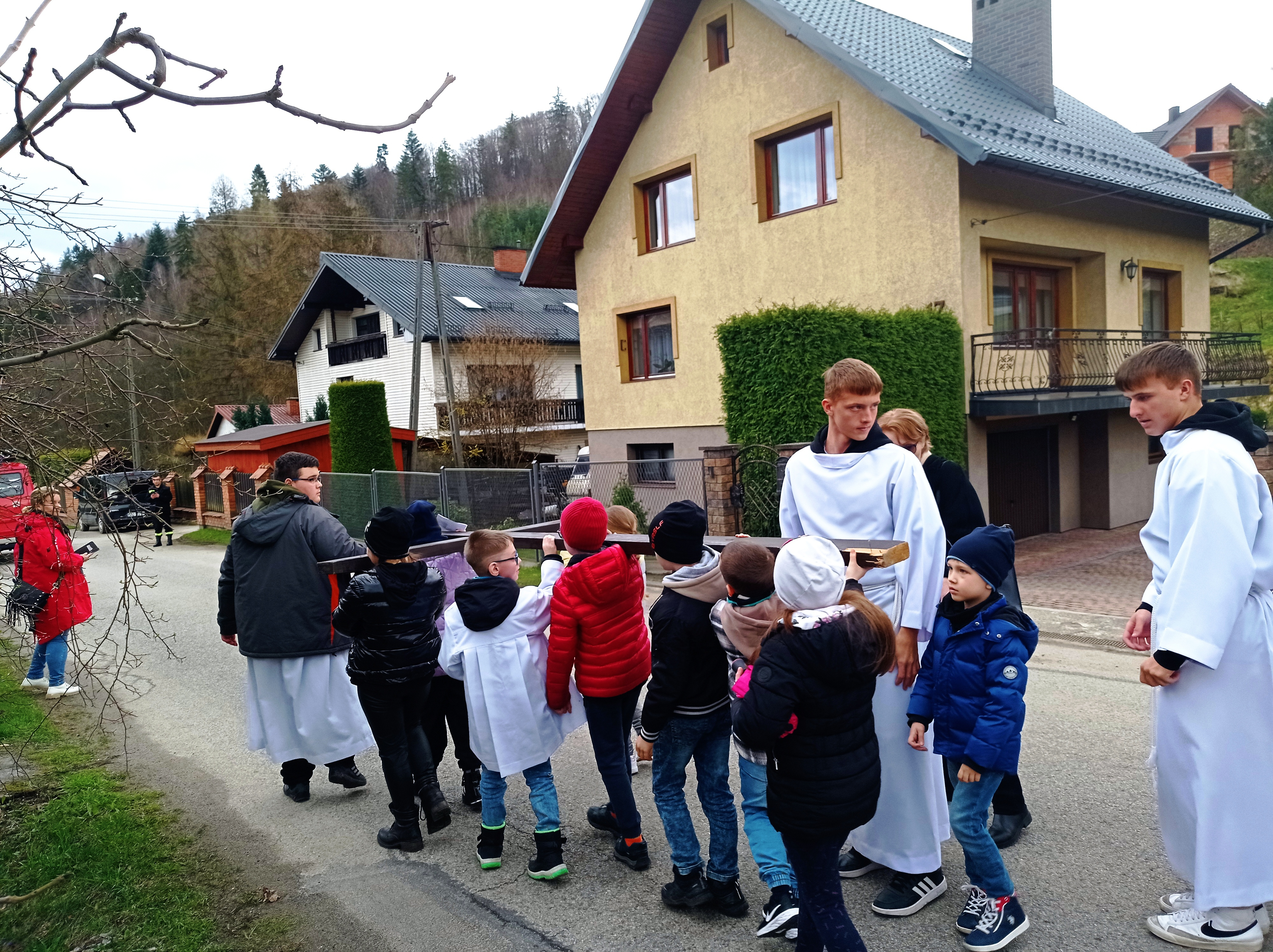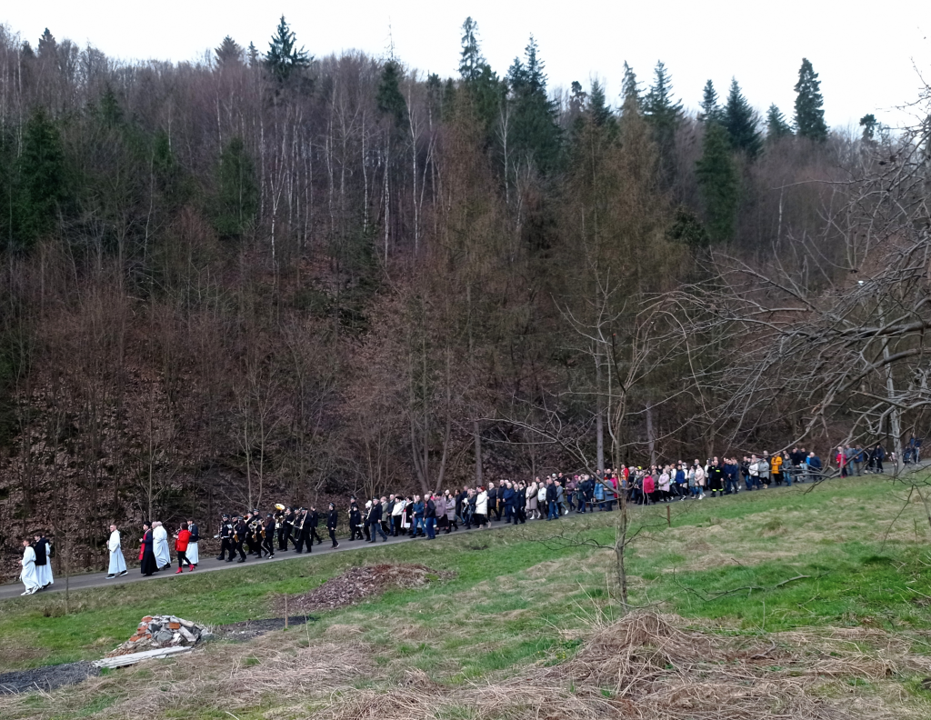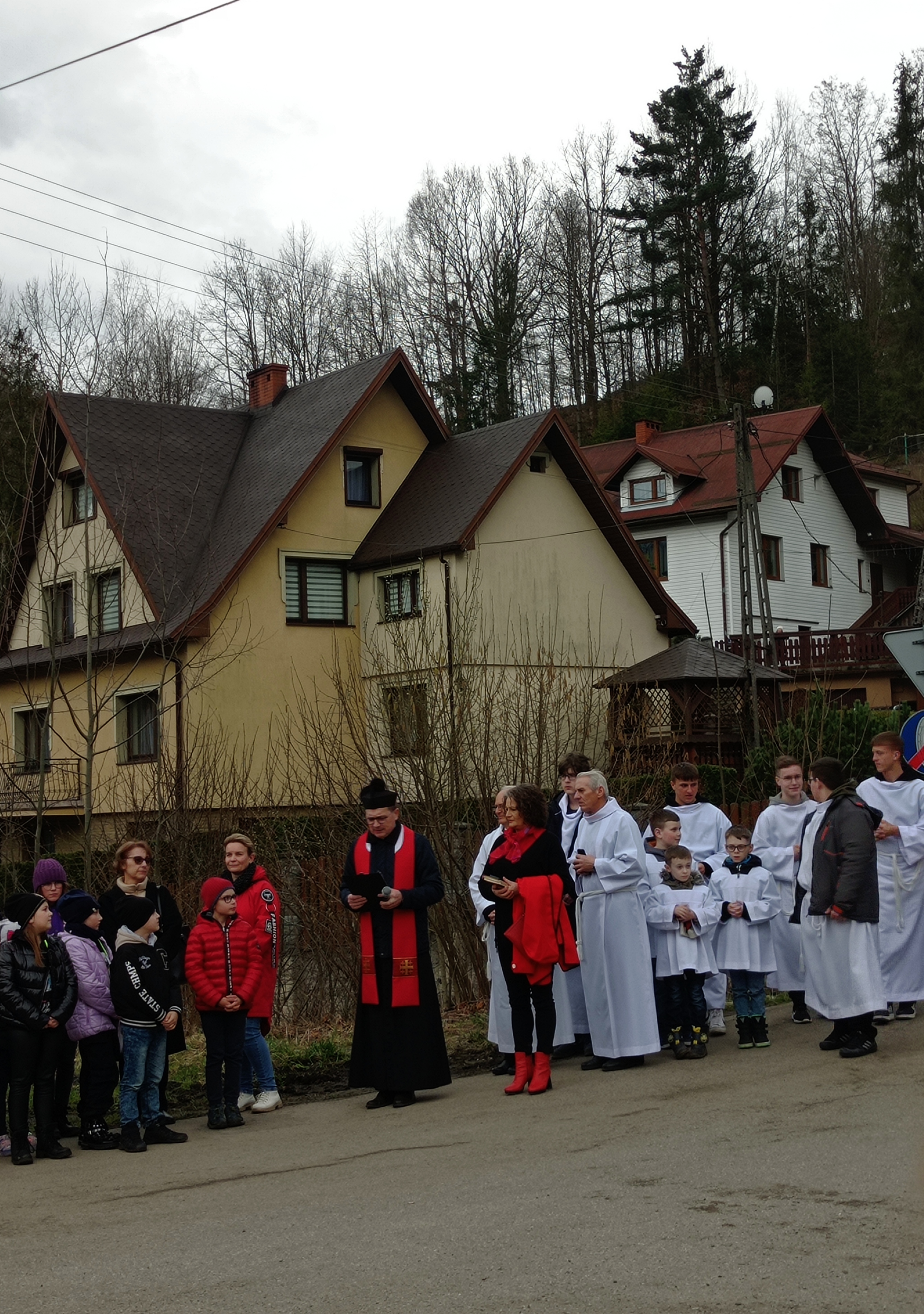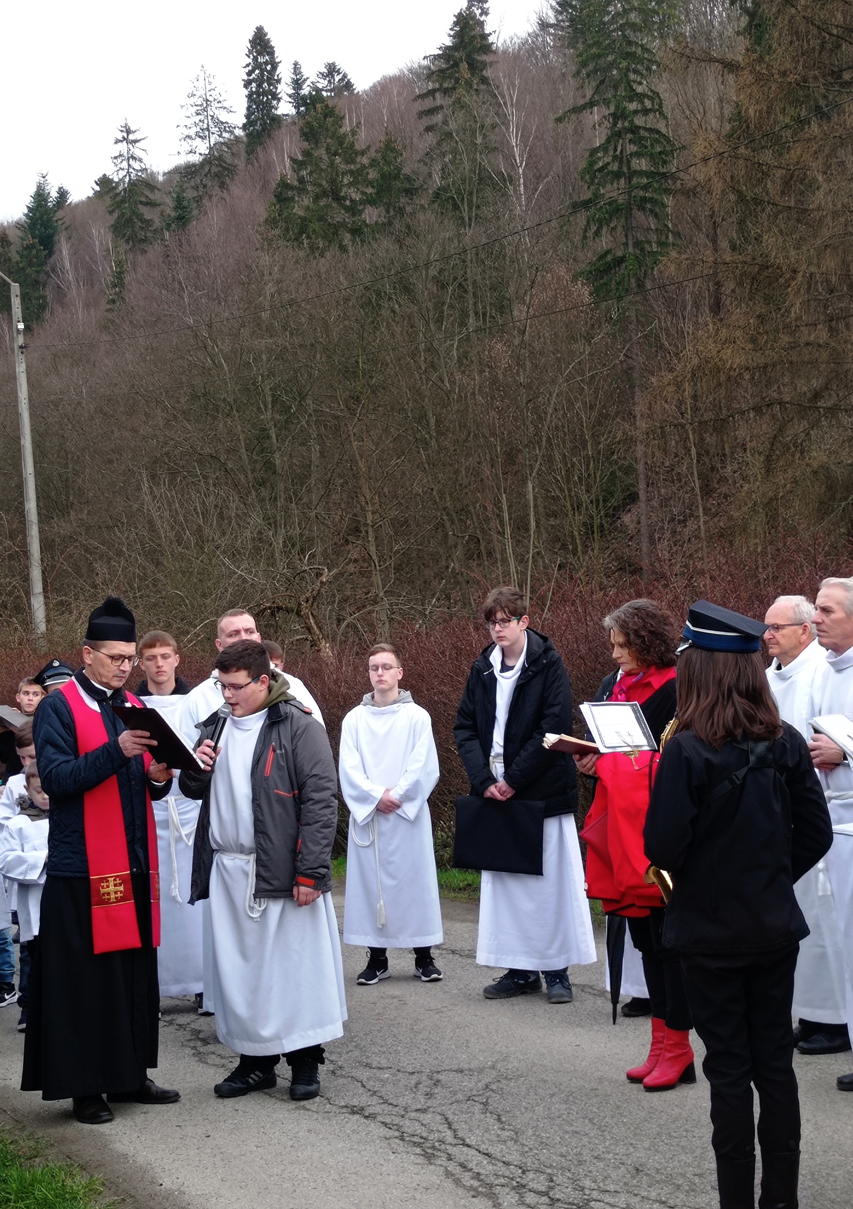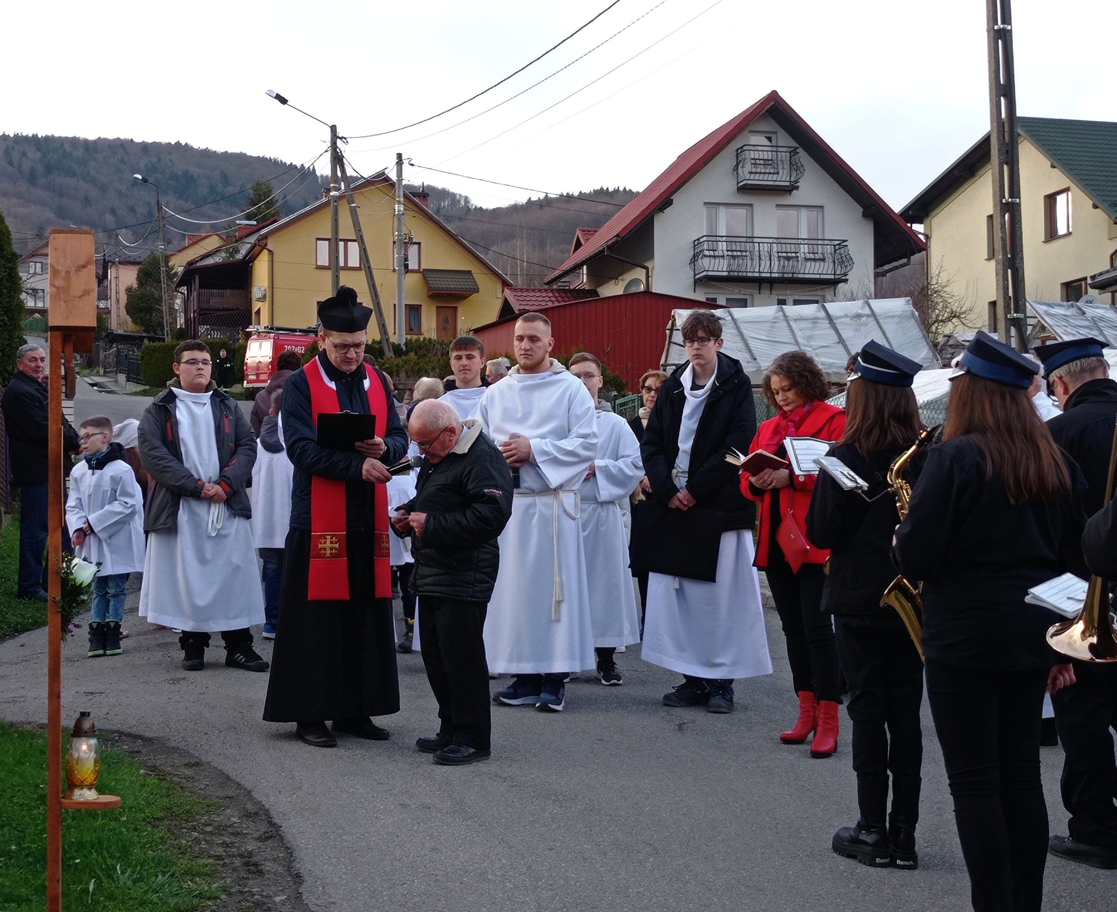 Rozpoczęcie rozważań Drogi Krzyżowej – krzyż nieśli członkowie poszczególnych grup parafialnych, przedstawiciele stanów: dzieci, młodzieży, dorosłych. Towarzyszyła nam Orkiestra Dęta.