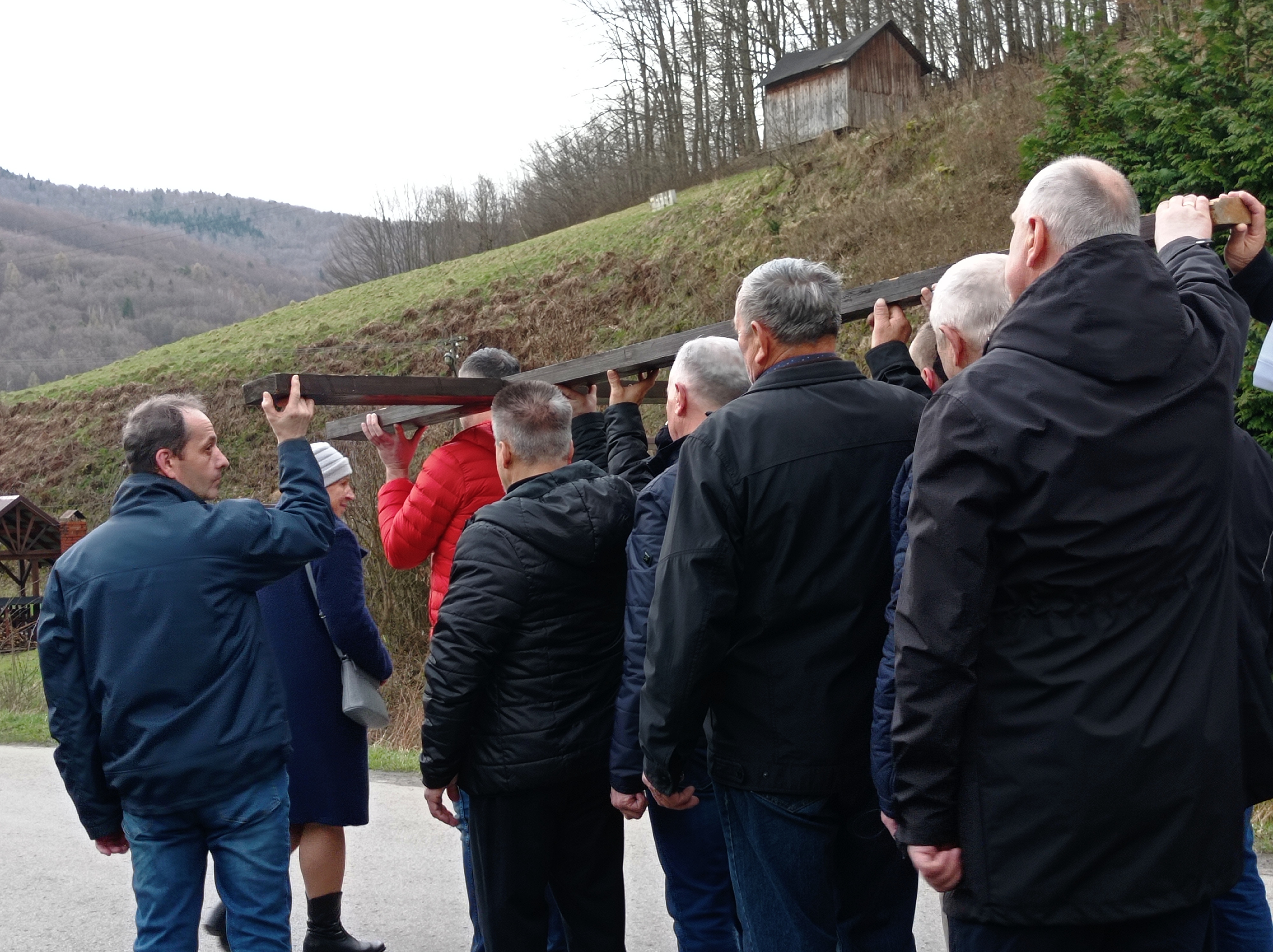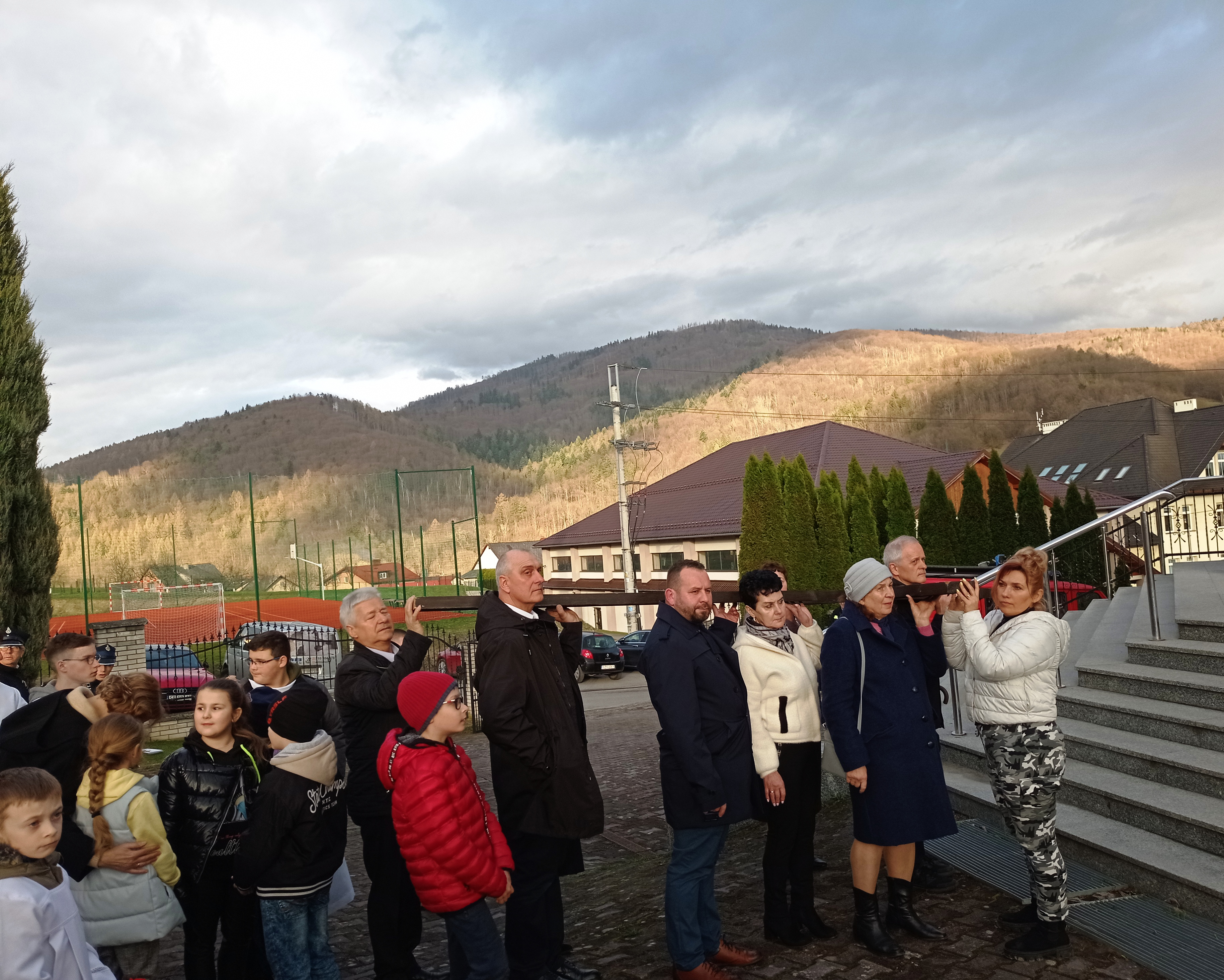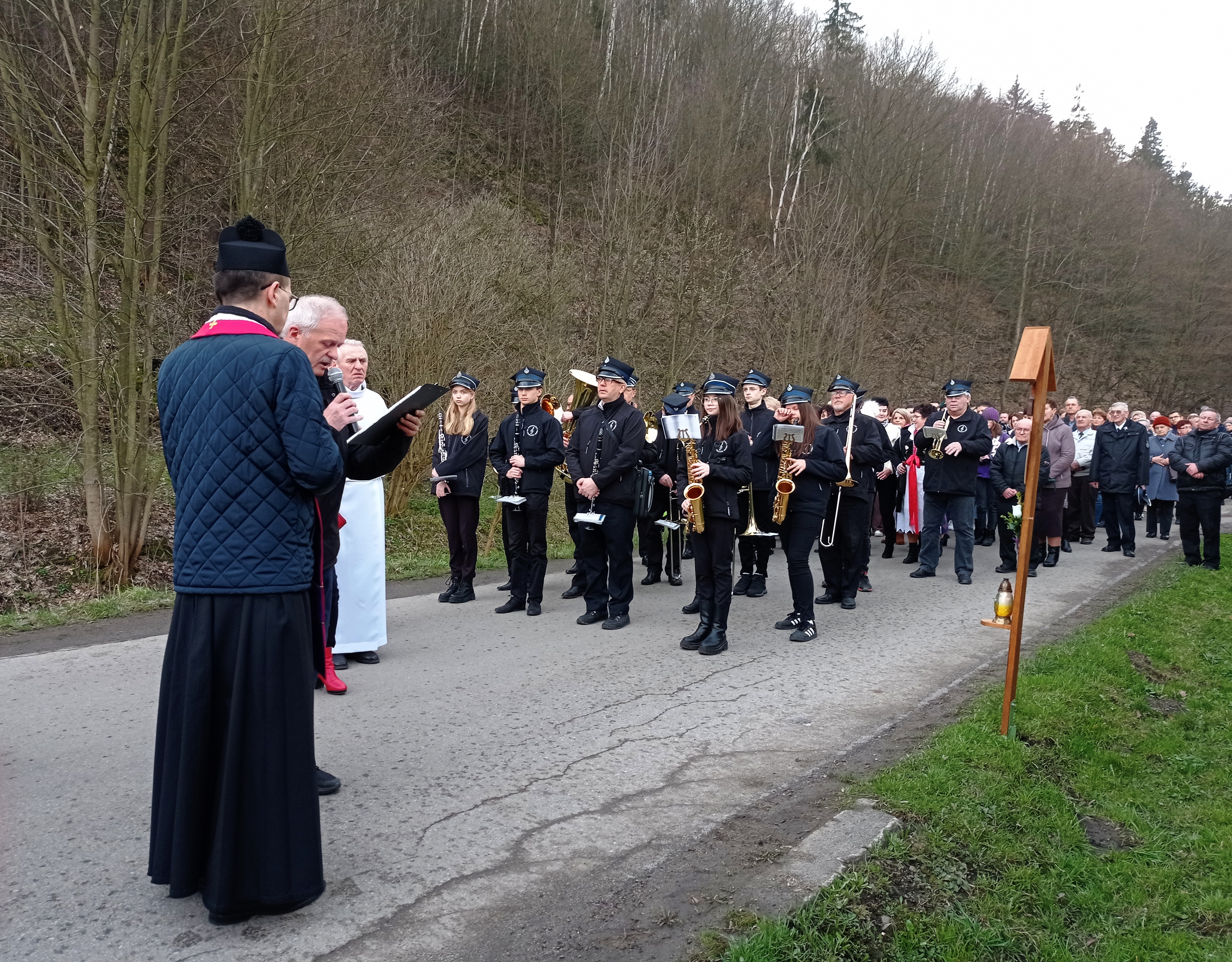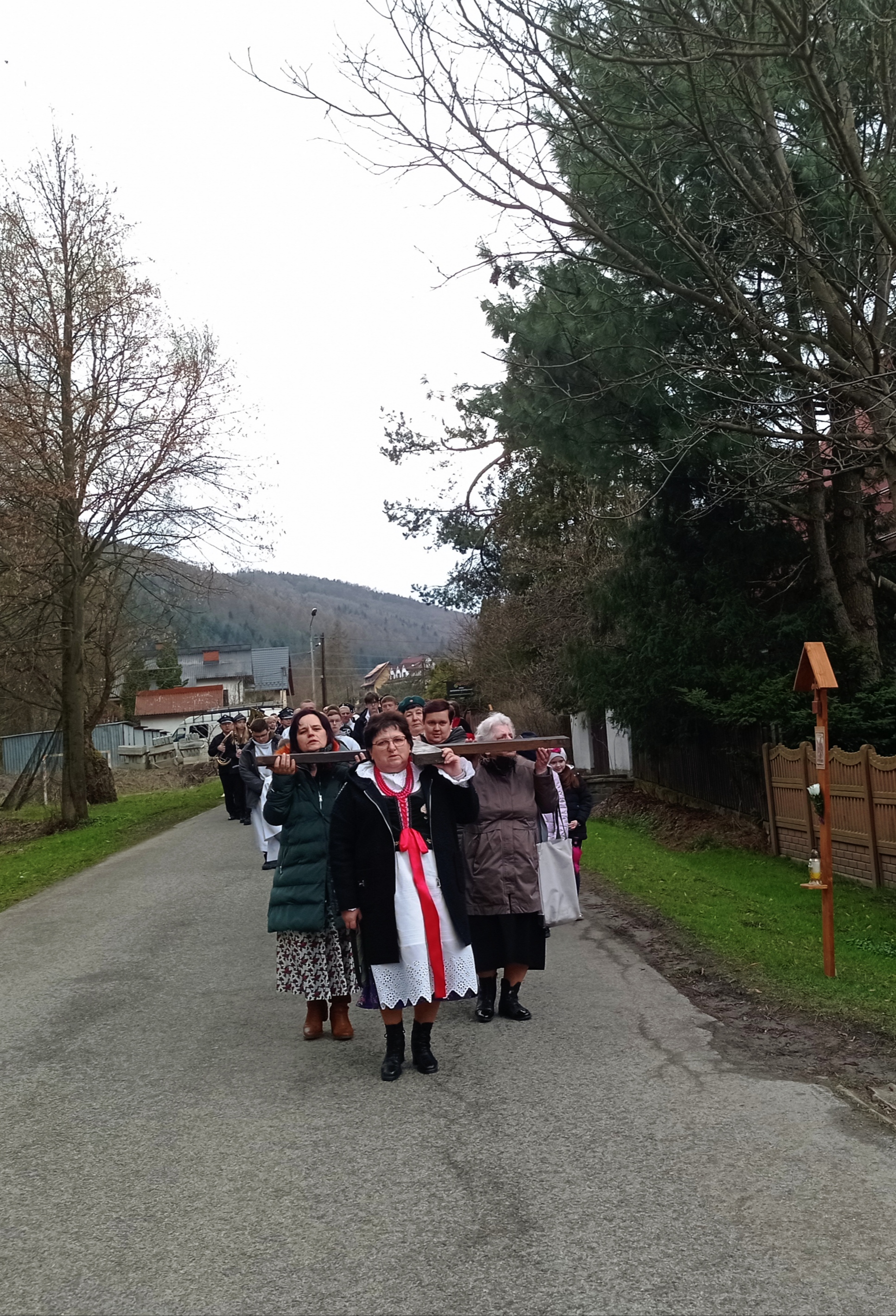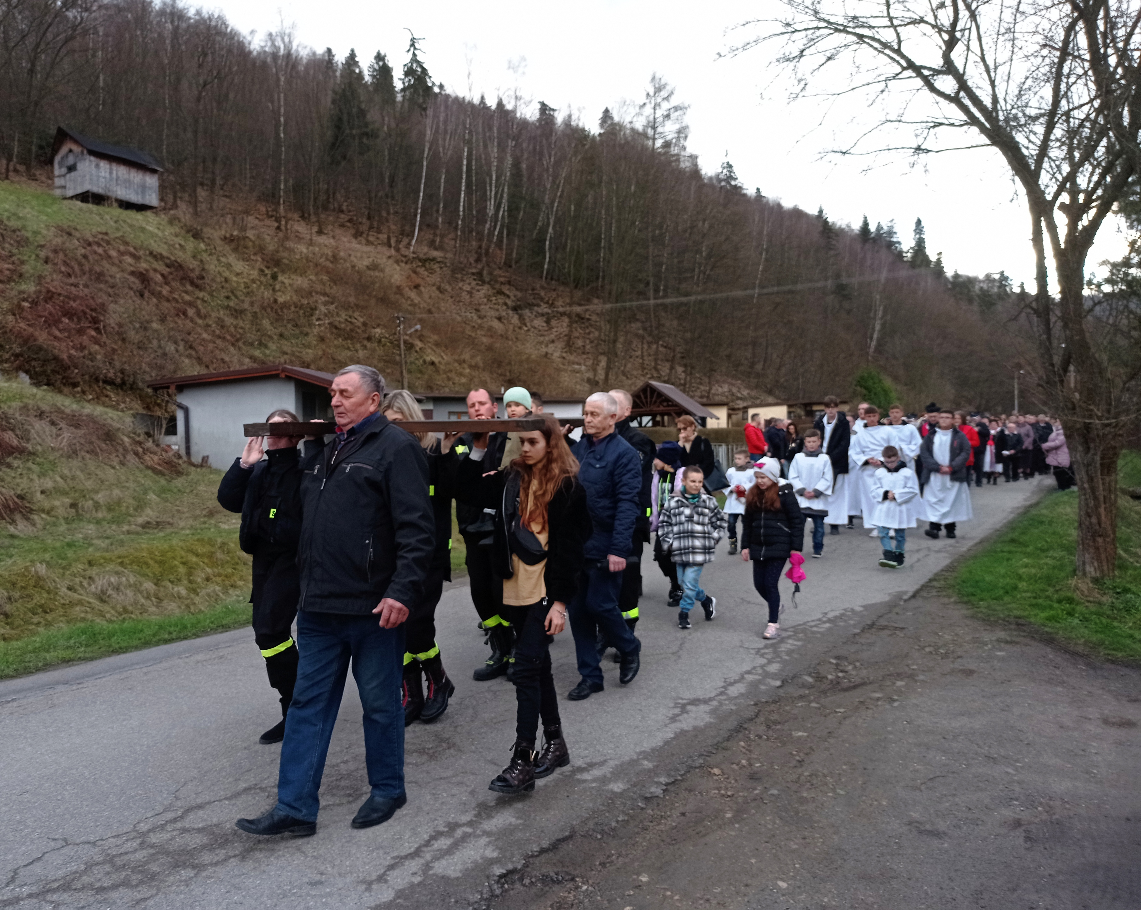 Rozpoczęcie rozważań Drogi Krzyżowej – krzyż nieśli członkowie poszczególnych grup parafialnych, przedstawiciele stanów: dzieci, młodzieży, dorosłych. Towarzyszyła nam Orkiestra Dęta.